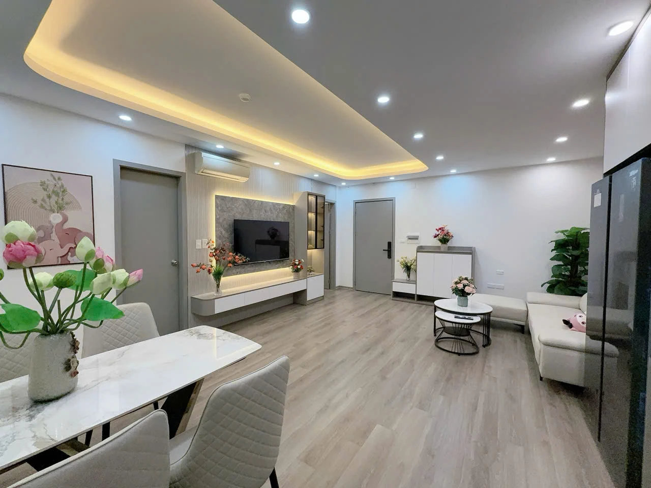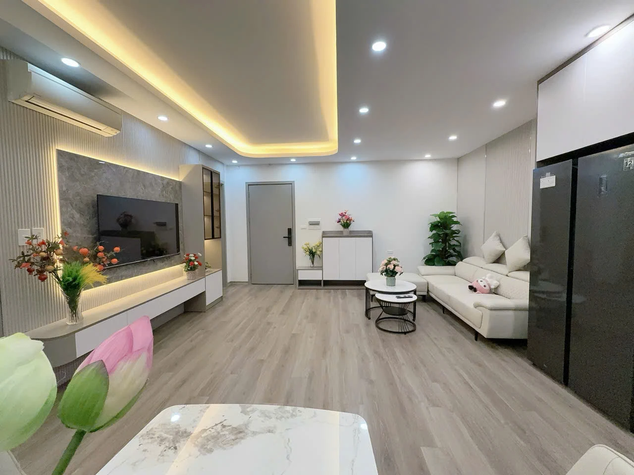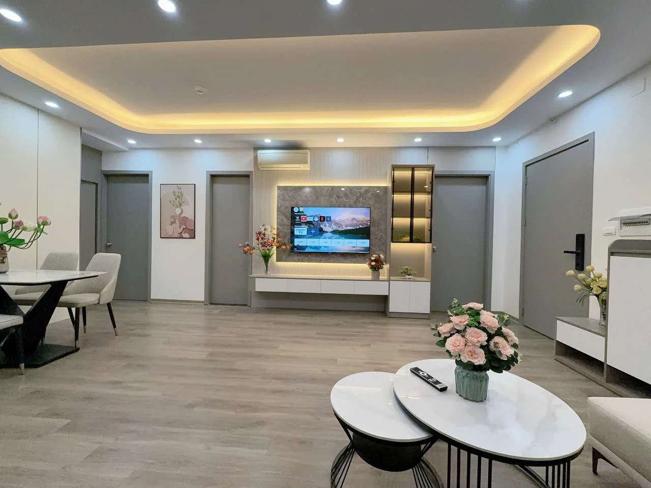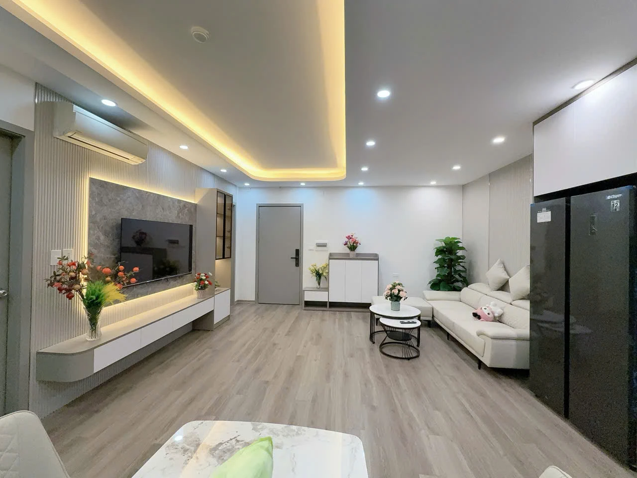 Căn hộ có thiết kế đẹp, bố cục rộng rãi: phòng khách vuông vắn, bếp riêng, các phòng ngủ thoáng và dễ sắp xếp nội thất. Diện tích 79m² – 2 ngủ + 1 phòng thiết kế thêm – 2WC Tầng đẹp, nhà hoàn thiện full nội thất chuẩn thiết kế, vào ở ngay: Sofa + bàn trà, bàn ăn nhập khẩu Smart TV 55”, vách – kệ trang trí 2 điều hòa, tủ lạnh, lọc nước 2 bộ giường tủ, bàn trang điểm LED Tủ bếp trên dưới, bếp từ – hút mùi Rèm, đèn, decor đầy đủ