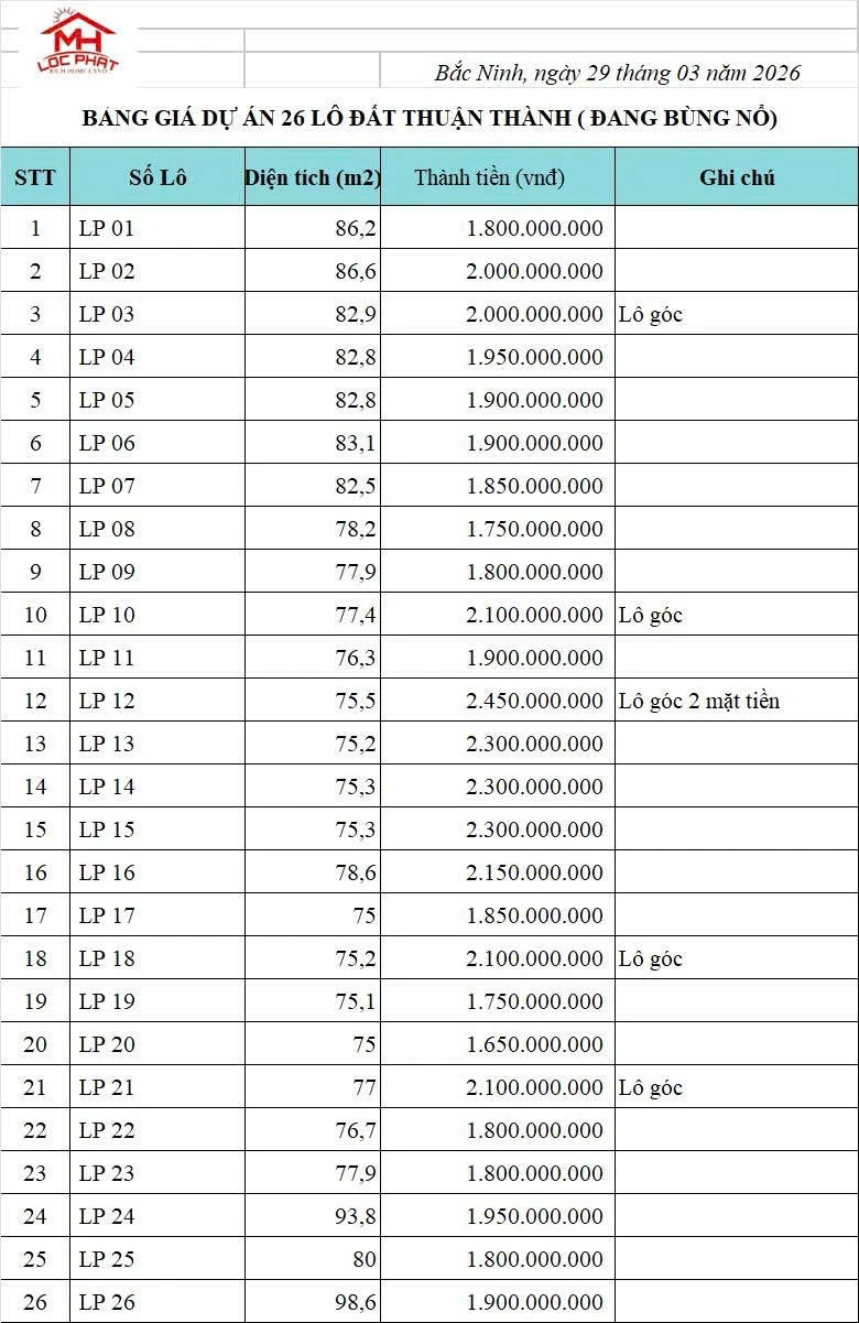 | Tên dự án: CHÍNH THỨC RA HÀNG 26 LÔ ĐẤT NHIỄM DƯƠNG – TRẠM LỘ, BẮC NINH | ||