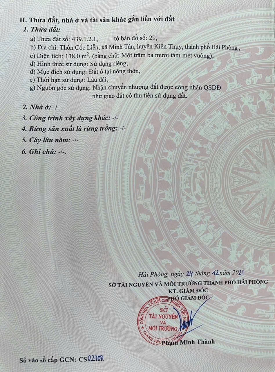 | Tên dự án: ĐẤT CỐC LIỄN MINH TÂN – 138M2 – NGÕ Ô TÔ THÔNG – GIÁ 12,X TRIỆU/M2 QUỸ ĐẤT DÂN CƯ HIẾM – ZALO 0567 222 555 | ||