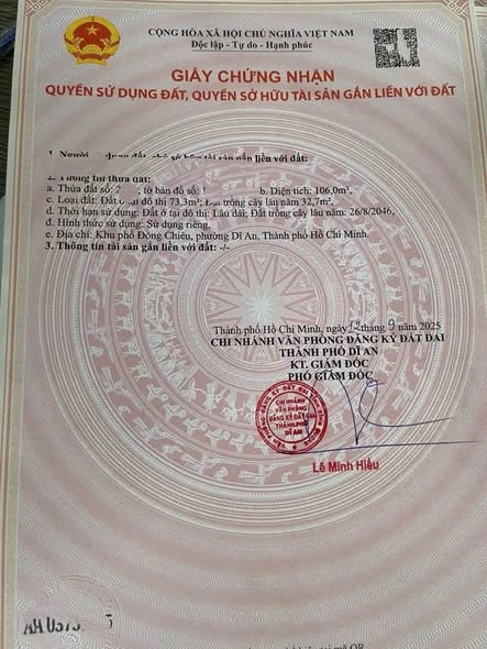 Đất sổ riêng gần đường Đặng Văn Mây ngã ba cây điệp , P. Đông Chiêu, TP. Dĩ An, TP.HCM Mới Ngay Cụm Trường Học Cấp 1-2 Đông Chiêu 500m Diện tích: 106m² (trong đó thổ cư 73m²) Ngang 4,4 dài 24m, xây dựng tự do Ngay khu trường học các cấp khu Đông Chiêu Giao thông thuận tiện, dân cư đông đúc gần các tuyến đường lớn, thuận lợi đi trung tâm Thủ Đức – Sài Gòn Giá 3ty2 gặp chủ thuong lượng Lh zalo 0986251768 hoặc 0938196626 Mr Thành gc |