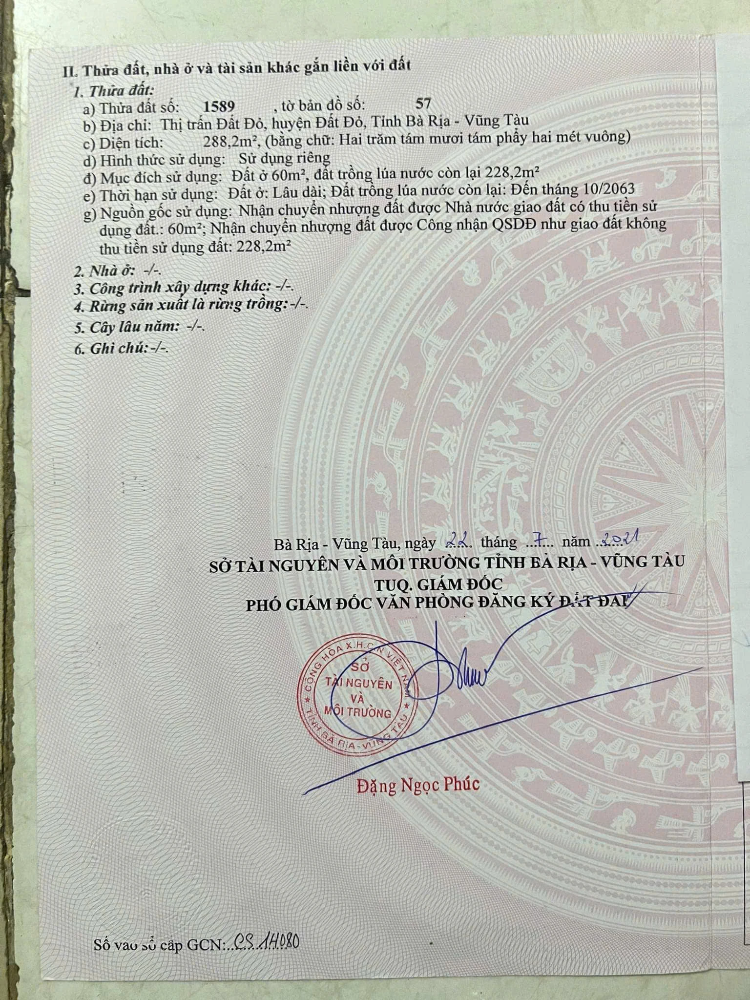 | Tên dự án: Thị trấn đất đỏ Lô đất mt trần huy liệu-thị trấn đất đỏ | ||