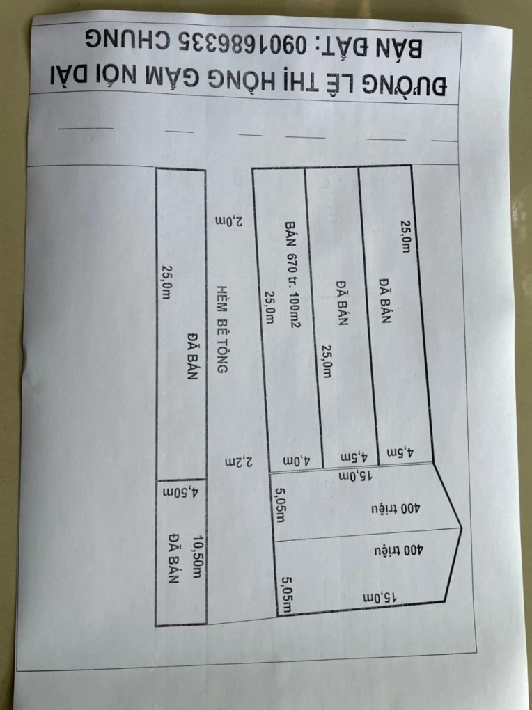 Mô tả thêm Mô tả: Bán Đất Đường Lê Thị Hồng Gầm Nối Dài, TP Phan Thiết - lô 1 100m2 gián 650tr - lô 2 75m2 gián bán 400 tr - Khu vực trung tâm, an ninh tốt đầy đủ mọi tiện ích xung quanh - Gần chợ trường học. Bệnh viện. - Đường rộng thuận tiện giao thông đi lại Liên hệ 0901686335 |