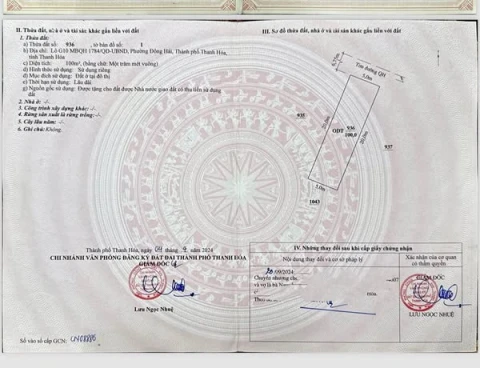 •Phường Đông Hải – TP. Thanh Hóa • Vị trí đắc địa – Không gian sống lý tưởng • Nằm trong khu đô thị Sông Nước, mặt bằng 1784 quy hoạch đồng bộ, dân cư đông đúc, hạ tầng hoàn thiện, pháp lý rõ ràng. • Gần chợ, trường học, bệnh viện, công viên… đầy đủ tiện ích sống và đầu tư. • Diện tích: 5x20=100m • Đường rộng thông thoáng, vỉa hè 2 bên.