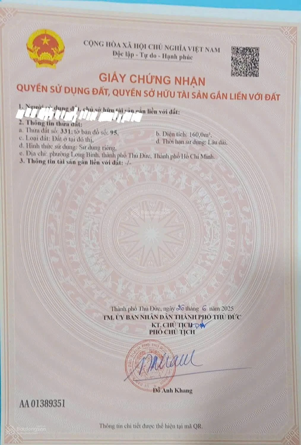 | Tên dự án: Bán lô đất số 331 KDC Long Bửu 160m², đường 10m, gần Vinhomes Grand Park, giá thương lượng, sổ CC | ||