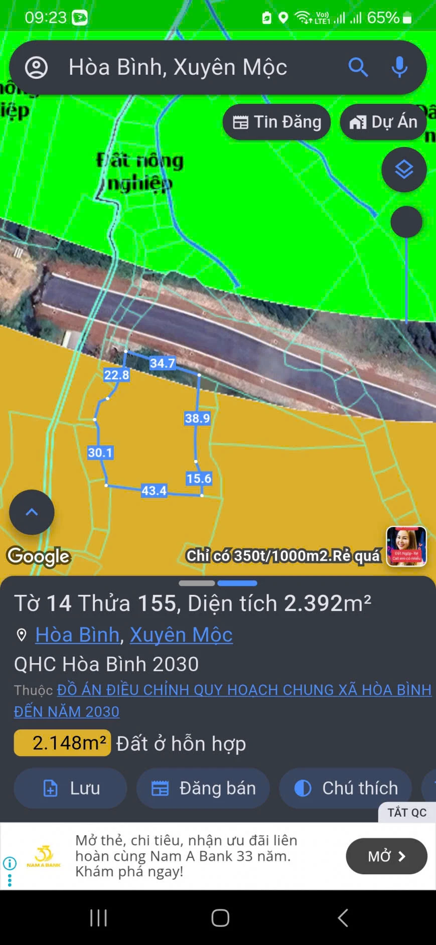 | Tên dự án: Cần bán 2392mv 34m mặt tiền đường lớn 160m thổ cư | ||