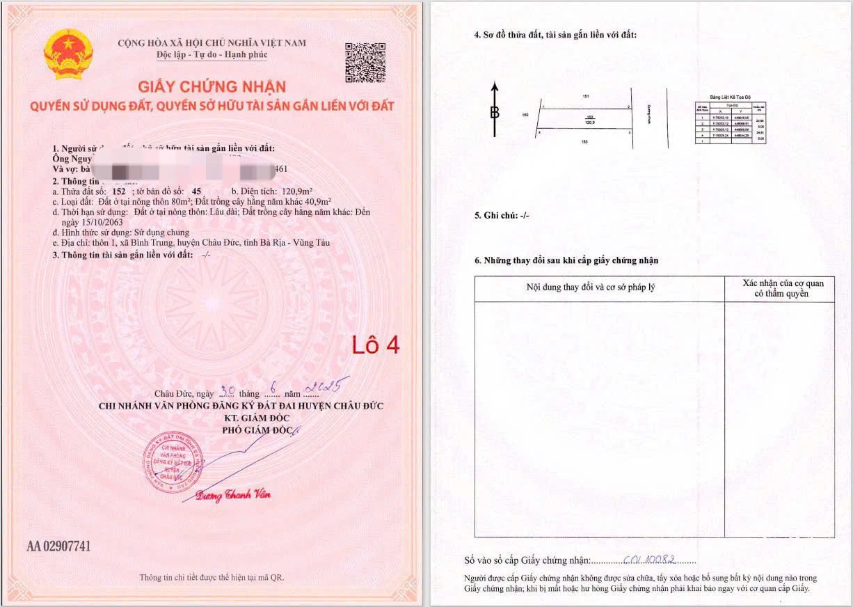 Chủ cần bán gấp 4 lô liền kề tọa lạc tại xã bình giã huyện châu Đức khu dân cư đường nhựa 7 mét