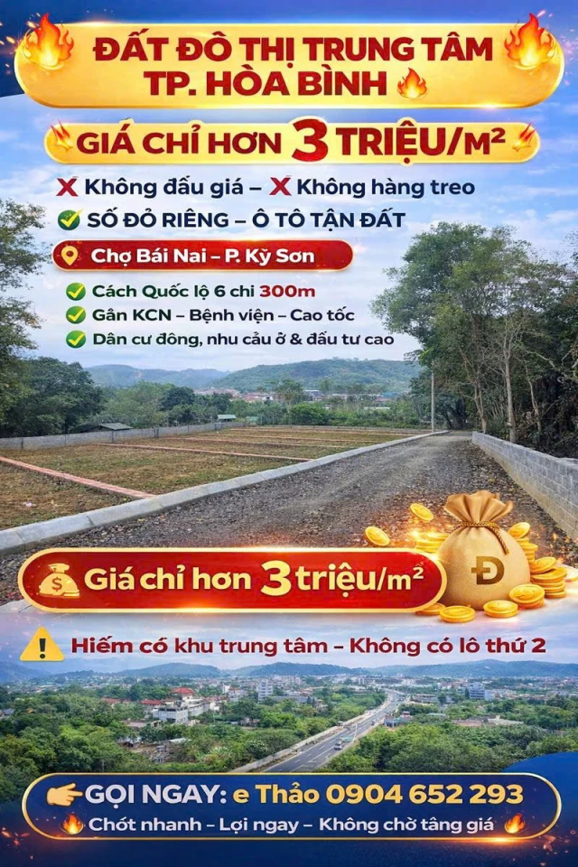 🔥 CHỈ HƠN 3 TRIỆU/M² – SỞ HỮU NGAY ĐẤT Ở ĐÔ THỊ TRUNG TÂM CHỢ BÃI NAI, P. KỲ SƠN 🔥 💎 Cơ hội đầu tư siêu lợi nhuận – Vị trí vàng ngay TP. Hòa Bình 💎 📍 Vị trí vàng – Tiện ích trong bán kính vài phút: 🛍 Chợ Bãi Nai: 300m 🚗 Quốc lộ 6: 300m – Huyết mạch HN – Tây Bắc 🏫 Trường học & Trung tâm phường Kỳ Sơn: 500m 🏭 KCN Mông Hóa & 🏥 Bệnh viện Lương Sơn: 600m 💧 Nhà máy nước sạch Lương Sơn: 700m 🛣 Cao tốc Hòa Lạc – Hòa Bình: 1,5km 🏖 KĐT nghỉ dưỡng Đảo Ngọc: 1,8km ⛳ Sân Golf Hilltop: 2,5km ✅ Sổ đỏ pháp lý minh bạch ✅ Ô tô vào tận nơi – dân cư sầm uất ✅ Giá siêu rẻ chỉ hơn 3 triệu/m² – cơ hội hiếm có 💰 Đầu tư hôm nay – Đón sóng tăng giá ngày mai! 👉 Liên hệ [e Thảo] để chọn lô đẹp nhất! |