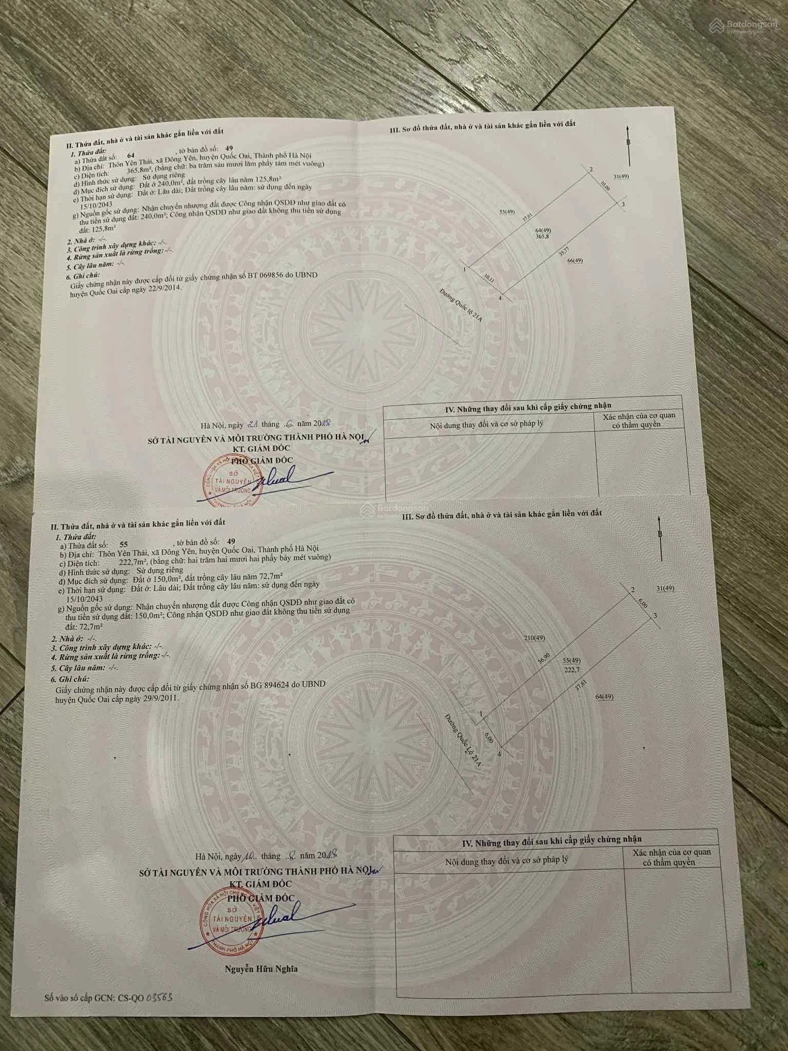 Chính chủ bán đất mặt đường QL21A Quốc Oai -DT 588m² (đã trừ mở đường 56m) thổ cư 390m² còn lại đất vườn mặt tiền 16m (gồm 2 sổ 6m 10m). Sổ đỏ chính chủ. |