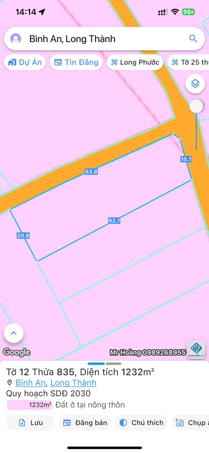 **1. THÔNG TIN CHUNG VỀ LÔ ĐẤT** * **Diện tích:** **1232 m²** (tương đương 20m x 63m). * **Pháp lý:** **Sổ hồng riêng, đủ điều kiện để sang tên ngay.** * **Vị trí & Kết cấu:** * **Mặt tiền:** 20m (rất rộng, thuận lợi để xây dựng kinh doanh, dịch vụ hoặc để xe hơi). * **Độ sâu:** 63m (có thể tạo nhiều không gian sử dụng: ở, làm doanh nghiệp, cho thuê...). * **Đường trước nhà:** Rộng rãi, thuận tiện cho việc giao thông và vận chuyển. **2. GIÁ BÁN & THỎA THUẬN** * **Giá:** **4.1 Tỷ** (Bốn tỷ một trăm triệu đồng). * **Hình thức thanh toán:** Thương trực tiếp với chủ đất. * **Ghi chú:** Giá trên có thể thương lượng trực tiếp để có mức giá tốt nhất. * **Tiến độ thanh toán linh hoạt:** Có thể hỗ trợ trả góp. **3. ƯU ĐÃI VÀ PHÁP LÝ** * **Sẵn sàng sang tên:** Chủ đất sẽ hỗ trợ thủ tục sang tên nhanh chóng, gọn lẹ. * **Các loại hình sử dụng phù hợp:** * Mua để ở lâu dài. * Mua xây xưởng, kho bãi, văn phòng. * Mua làm mặt bằng kinh doanh, cửa hàng, nhà hàng, quán cafe... * Đầu tư mua bán, chờ tăng giá trị. **4. VỊ TRÍ ĐẶC BIỆT TẠI LONG THÀNH** * **Tiện ích:** Nằm tại khu vực đang phát triển mạnh mẽ của Long Thành, gần các trường học, chợ, siêu thị, khu dân cư đang dần hình thành. * **Kết nối:** Vị trí thuận lợi kết nối với các tuyến đường huyết mạch như cao tốc Biên Hòa - Vũng Tàu, đường vành đai 3, sân bay quốc tế Long Thành... là một trong những khu vực có tiềm năng tăng giá bất động sản hàng đầu Đồng Nai. **5. THÔNG TIN LIÊN HỆ** * **Số điện thoại:** **0799 086 456** * **Diện tích đẹp:** Lô đất 20x63 có hình dáng đẹp, vuông vức, không bị méo mó, rất được ưa chuộng. * **Mặt tiền rộng:** 20m là mặt tiền lý tưởng cho nhiều mục đích sử dụng khác nhau. * **Pháp lý hoàn hảo:** Luôn là yếu tố số 1, đảm bảo an toàn tuyệt đối cho người mua. * **Giá tốt:** Với một lô đất có đầy đủ tiện ích và pháp lý như vậy ở vị trí Bình An, Long Thành, mức giá 4.1 tỷ là một mức giá cạnh tranh, có cơ hội thương lượng tốt. Ngoài ra còn một số lô xung quanh cần bán Liên Hệ xem thêm các lô khác. |